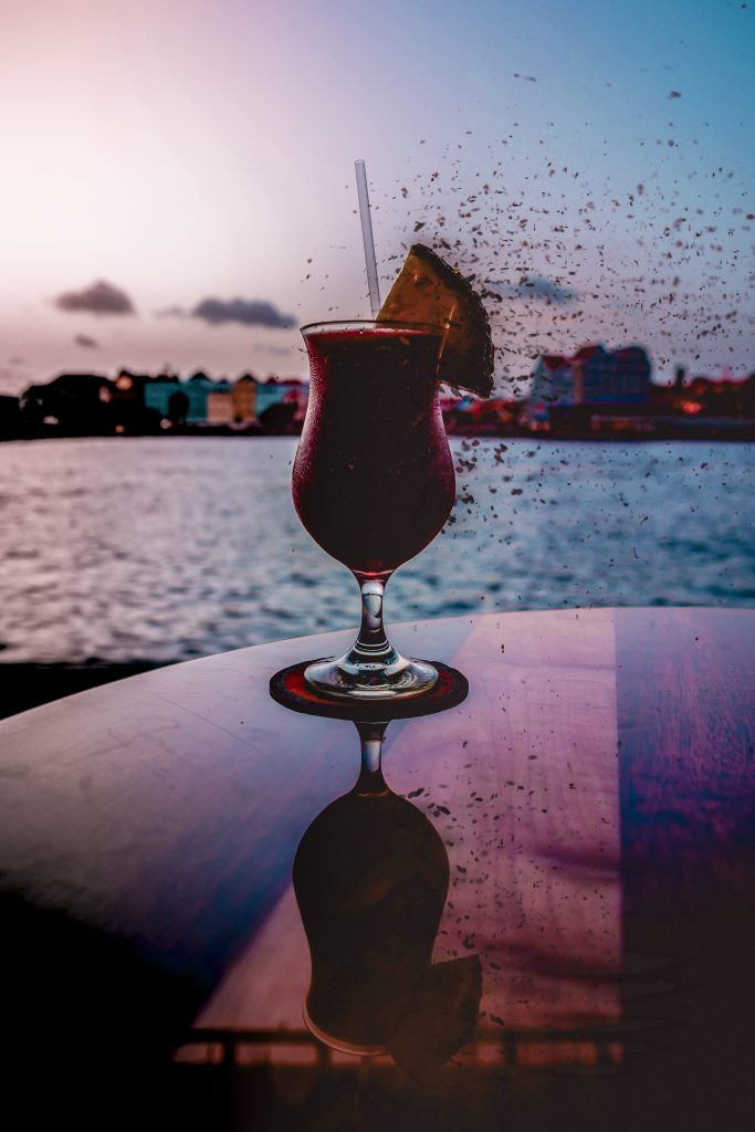 Dit unieke kunstwerk, genaamd Evening Bliss, vangt het magische moment van ontspanning aan het water. Met een prachtig samenspel van licht en kleur vertelt het een verhaal van elegantie en rust, terwijl de dynamiek van het opspattende drankje een speels contrast toevoegt.